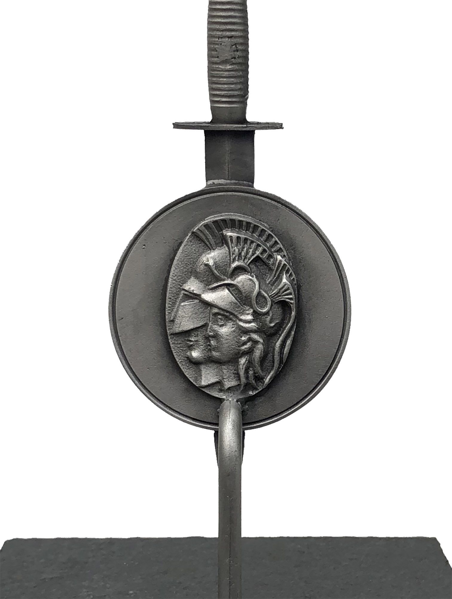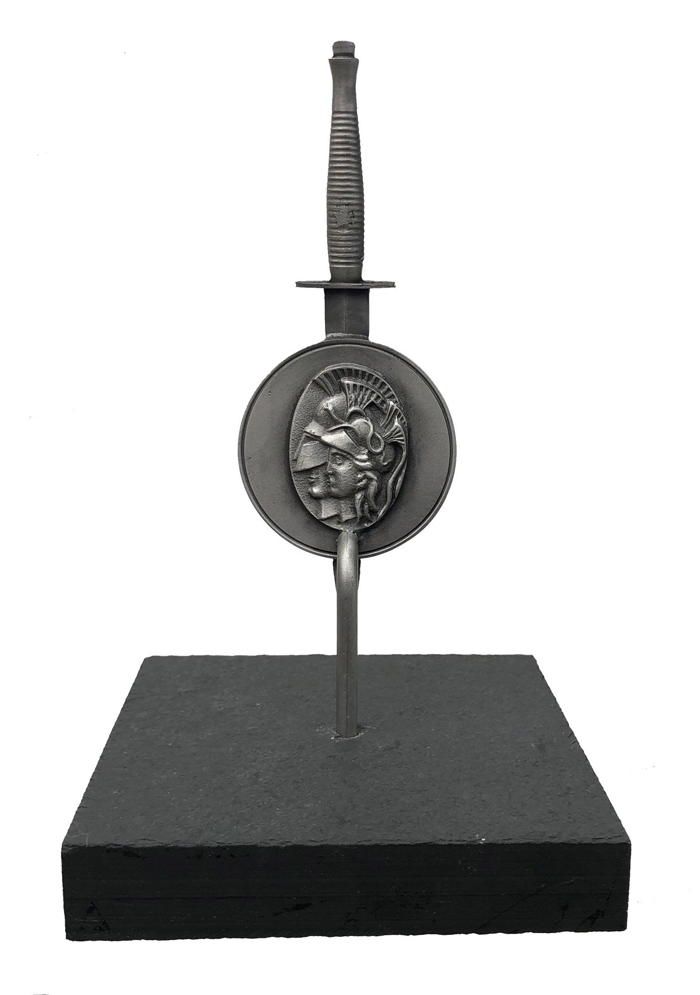 The presentation piece consists of a pewter coin on a commando dagger that mounts to a slate stand.