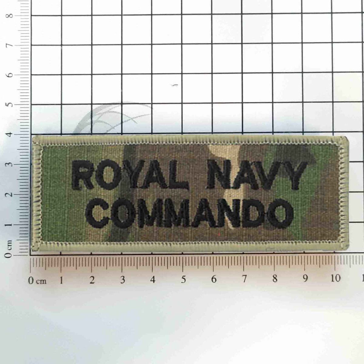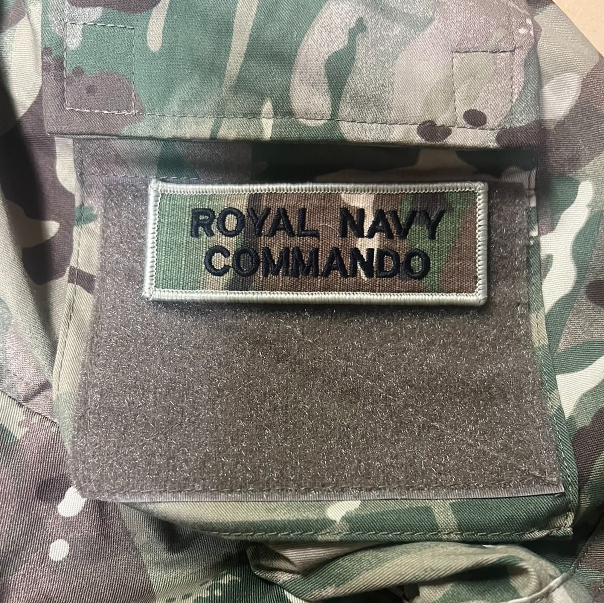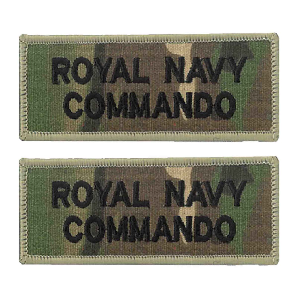 Royal Navy Commando Rectangle Titles, otherwise known as a Royal Navy Commando Shoulder Flash Pair. Black on MTP. Backing and overlocking colour is Tan, the writing is in Black. Velcro is used to be attached directly to the shirt or smock.