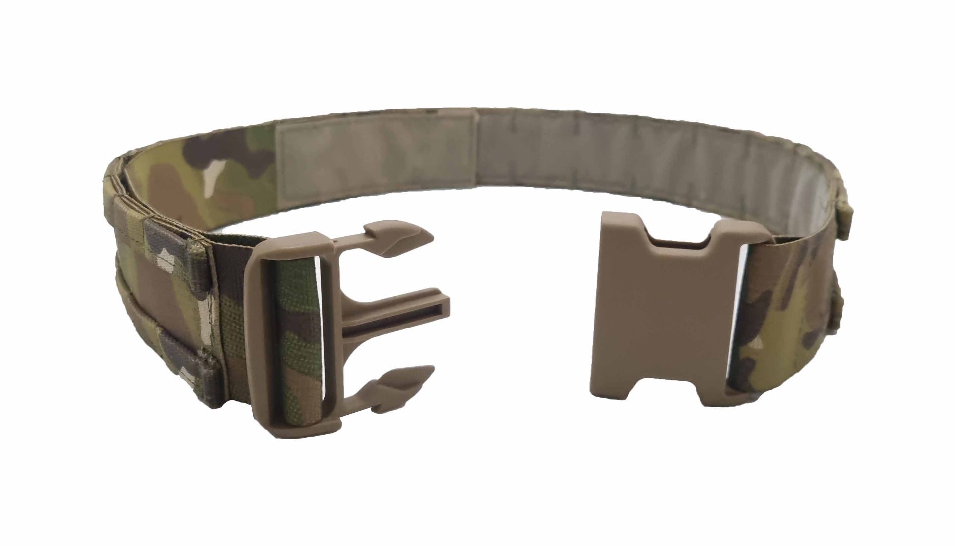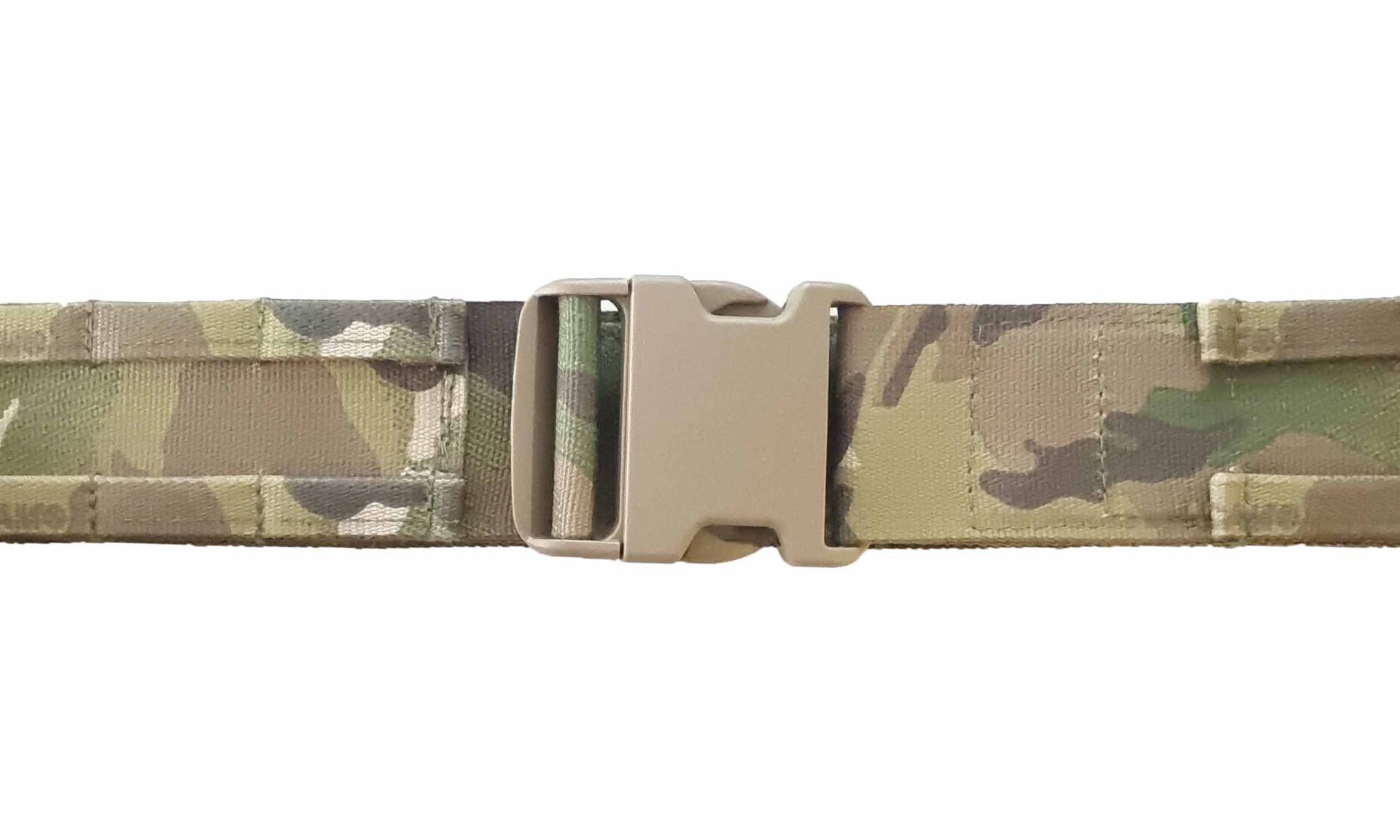 The webbing is doubled and a special layer is sewn in between giving the belt extra stiffness, this layer allows the belt to be comfortable but also prevents the webbing rolling when drop legs, pouches and holsters are attached.