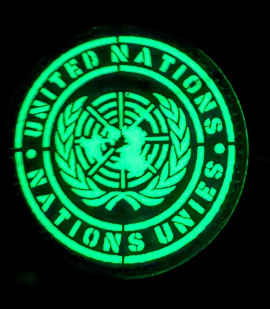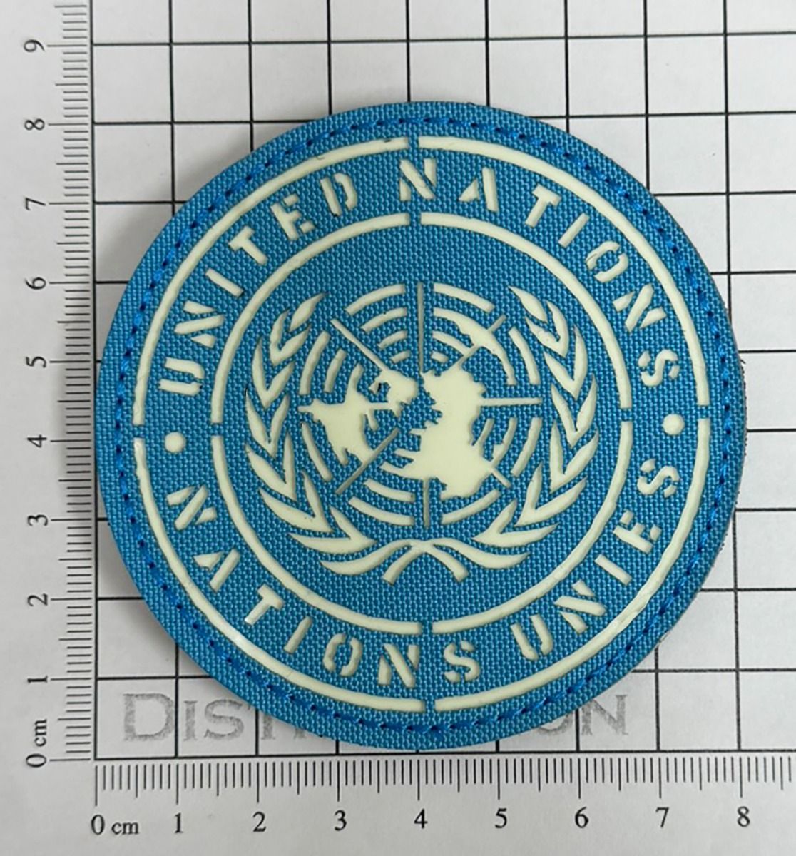 8cm round United Nations badge with laser-cut detail and photoluminescent glow-in-the-dark finish. Velcro backed for easy attachment to uniforms or gear.