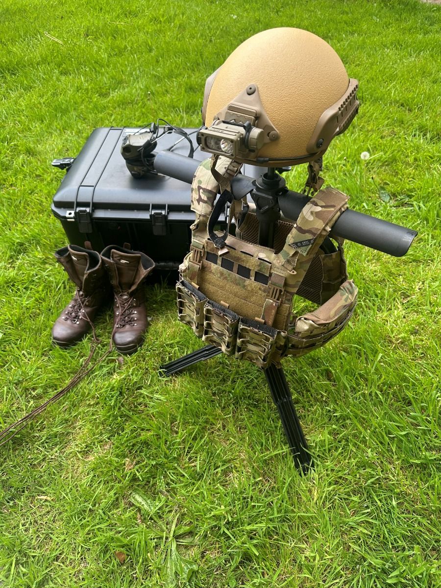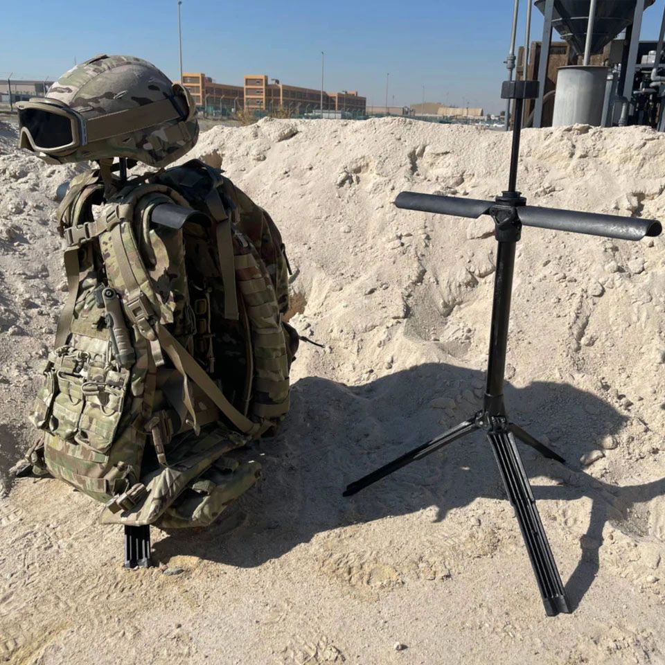 The WOBIG portable gear stand is a compact, lightweight, and durable stand designed to keep tactical gear—such as body armour, helmets, and weapons—clean, dry, and readily accessible in various environments.