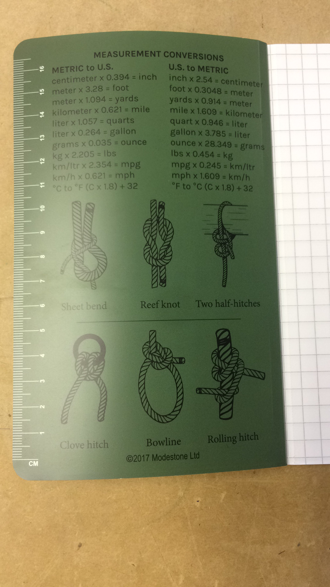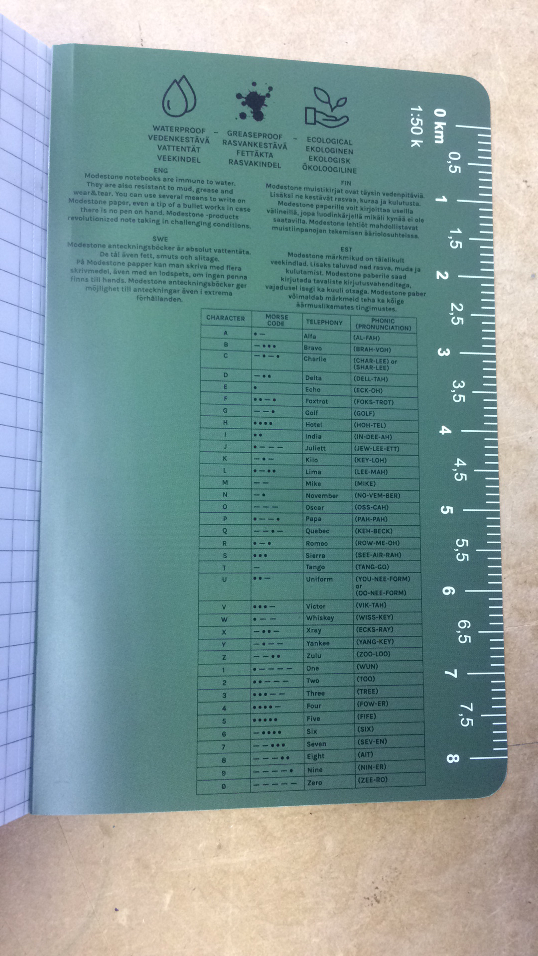 The Modestone stone paper notebook enables convenient note taking and drawing. The notebook comes with measurement conversions and pictures of the most common knots. It also has a morse code table and the phonetic alphabet with pronunciation.