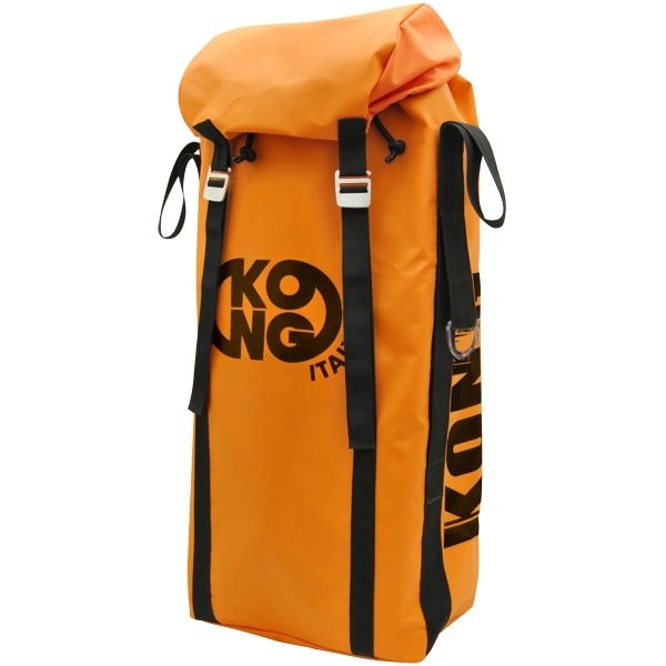 A 60L KONG Cargo bag with comfortable padded adjustable shoulder straps; fitted with an ergonomic back side, a lateral handle and double lateral D-rings for barycentric suspension.