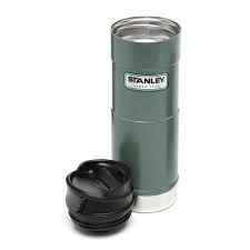Vacuum insulated body and thermal lid. Push button lid allows you to open, drink and close with one hand.