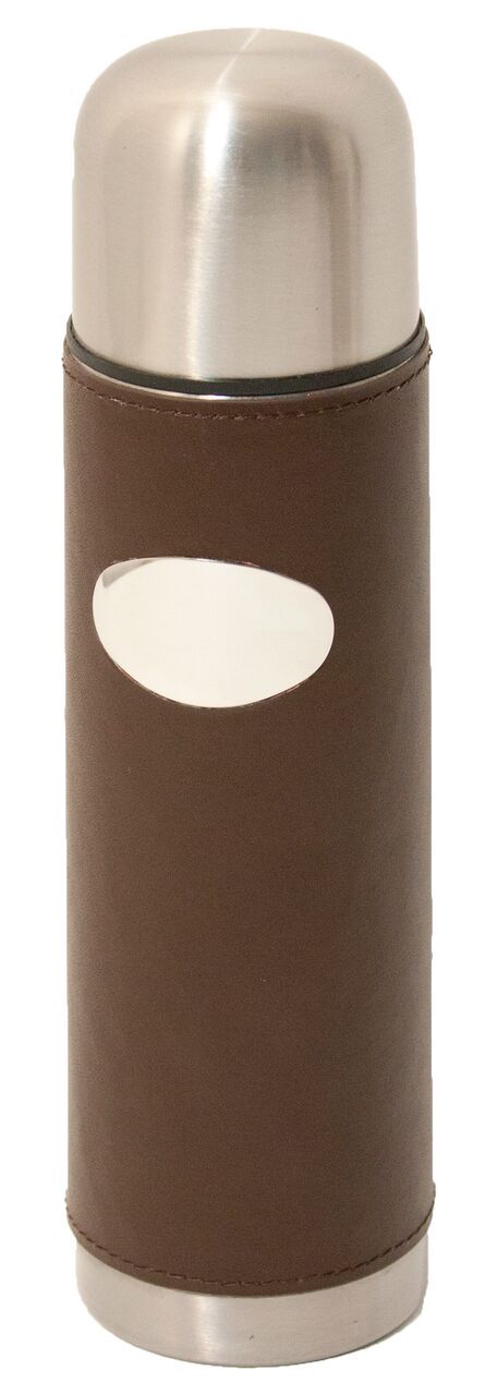 500ml vacuum flask with brown leather cover. Double stainless steel vacuum body, push and pour stopper, will keep drinks warm and cold.
