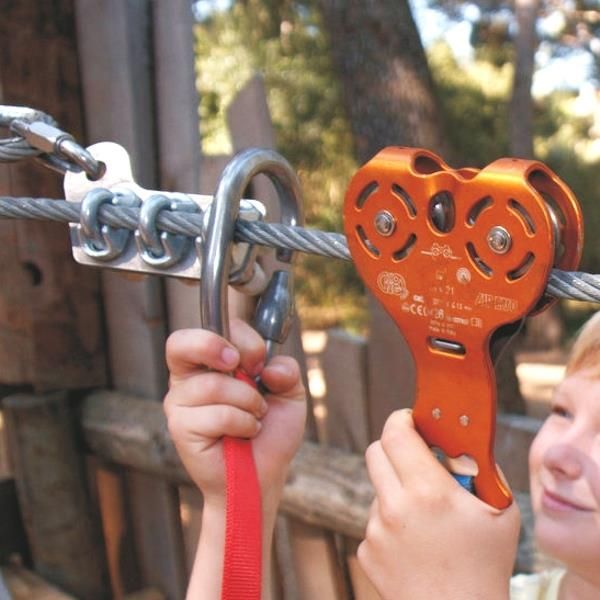 The principle of operation is very simple: the hook's opening is smaller than the diameter of the cable, but greater than the thickness of the plates. In this way, safety is guaranteed. Once you enter the lifeline, it is impossible to accidentally disconnect before the end of the course. Only by a special key supplied to the manager of the park, it is possible to unlock the sleeve and then make ultra-rapid evacuations in case of illness, storm, fire, etc...