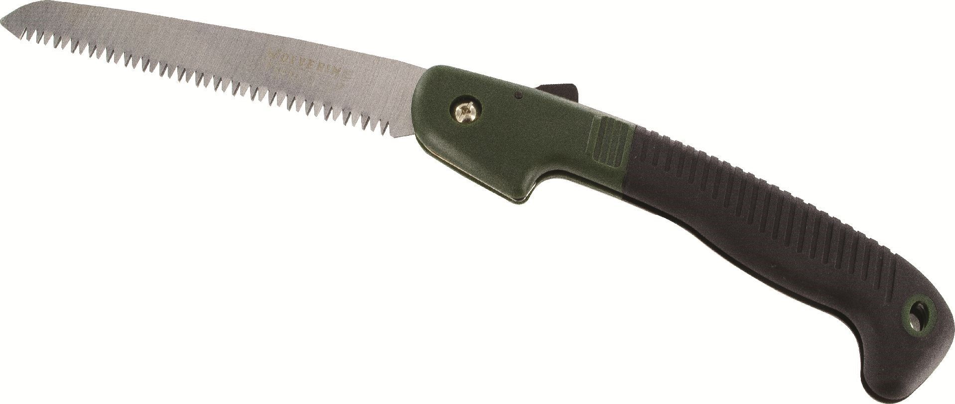 A large folding saw with jagged edge for cutting green and dead wood with ease.