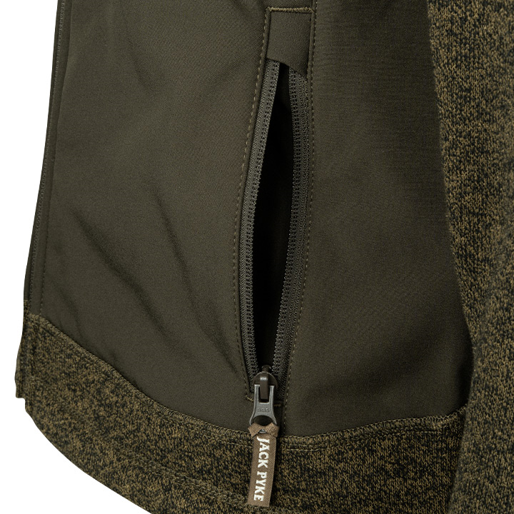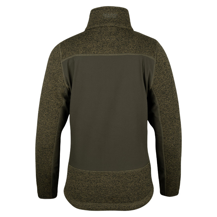 Jack Pyke Ladies Hybrid Jacket in green – softshell and mélange fleece design with full zip, elasticated cuffs, and zipped pockets. Perfect for outdoor and casual wear.