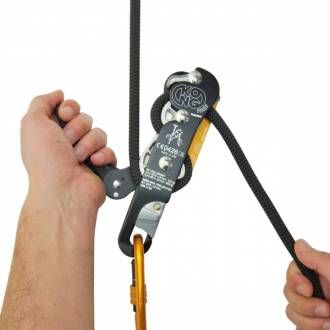 Certified for two people, it allows two people to lower at the same time and also allows the user to take in rope slack.