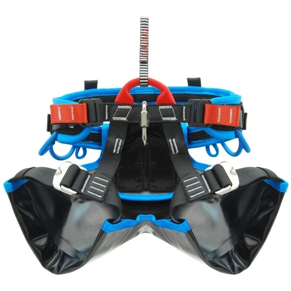 Canyoning harness that combines the comfort of a mountaineering harness with the abrasion-resistance and shape necessary for caving and canyoning.