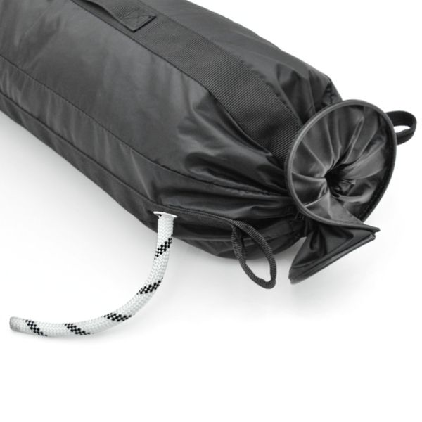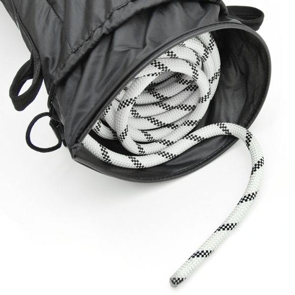 The upper opening features a rigid cable that holds it in the open position, making it easy to feed rope in and out of the bag.