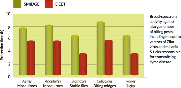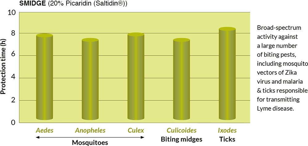 Smidge has a tough, yet family-friendly formula containing 20% Picaridin (Saltidin®), an active ingredient giving you instant protection for up to 8 hours. Yet unlike DEET, Smidge is non-corrosive, and won’t melt your watch or your boots. As you can see from the chart below it works across a broad spectrum of biting pests, including mosquitoes (vectors for Zika Virus and Malaria) and ticks (vectors for Lyme disease).