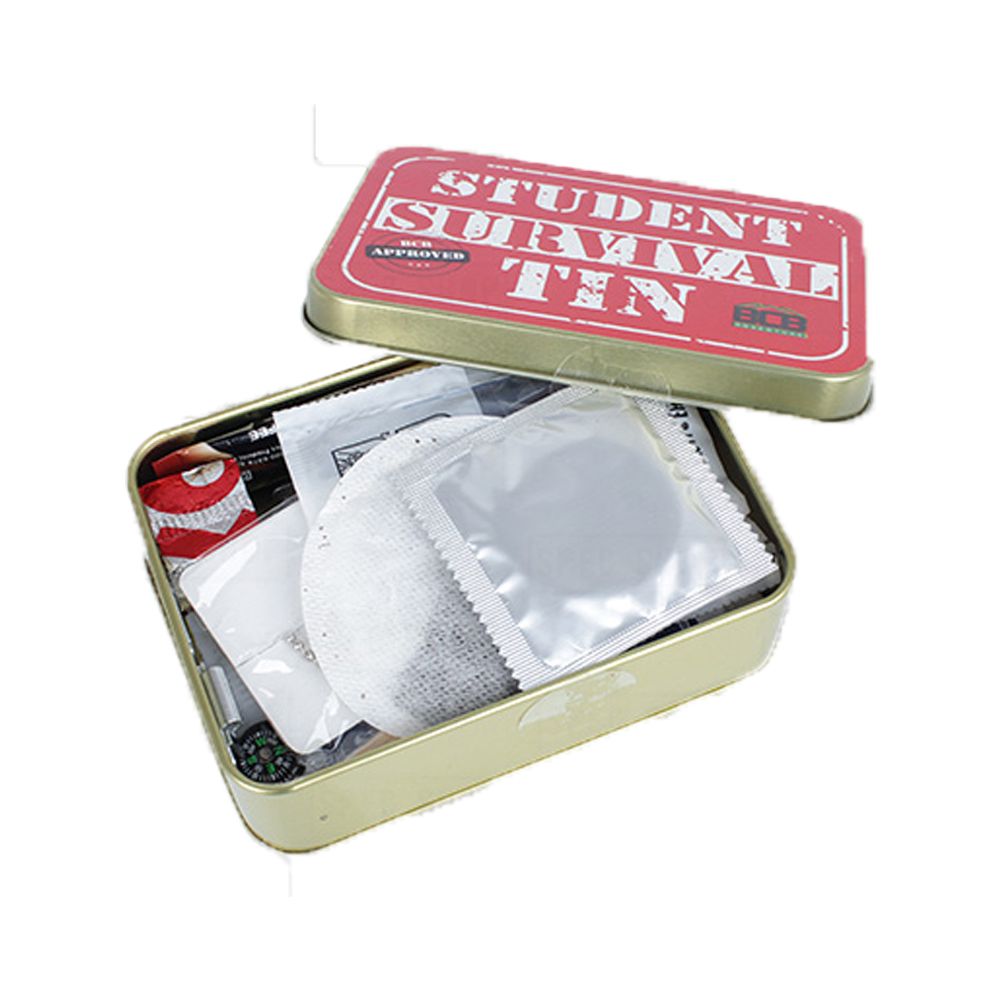 The Student Survival Tin, impress everyone on day 1, everything you need in a tin, real GI Army Dog Tags, Energy food and drinks, a spork for eating one handed, a tiny tin opener, ear plugs (to stop scary house noises) pencil & paper for food lists, a compass to find your way around and emergency condom (don’t confuse with the tea bag, that’s full of holes!!)