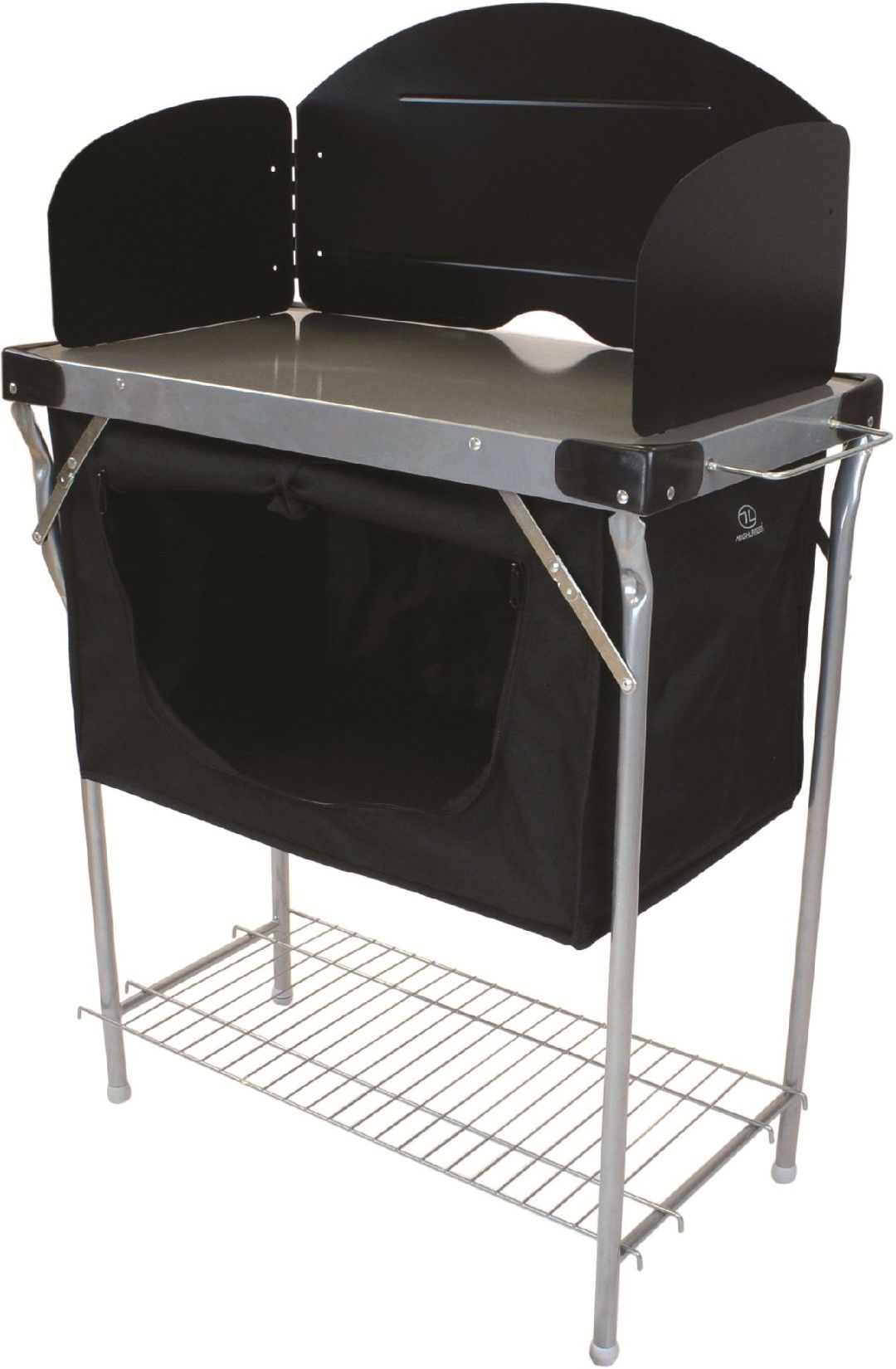 A kitchen stand that holds a stove and a cupboard below for storing kitchen and food items whilst camping.