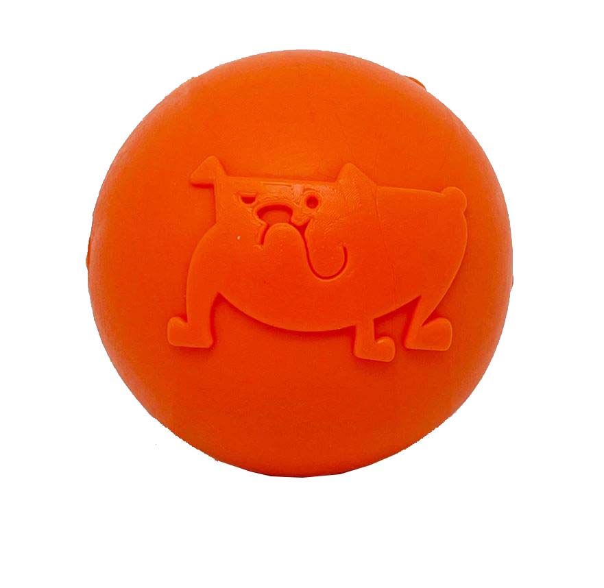 - DOG BALL WITH AN ATTITUDE! Stimulating and entertaining for dogs. The solid synthetic rubber design provides strength yet enough give to hold up while still stimulating their chompers