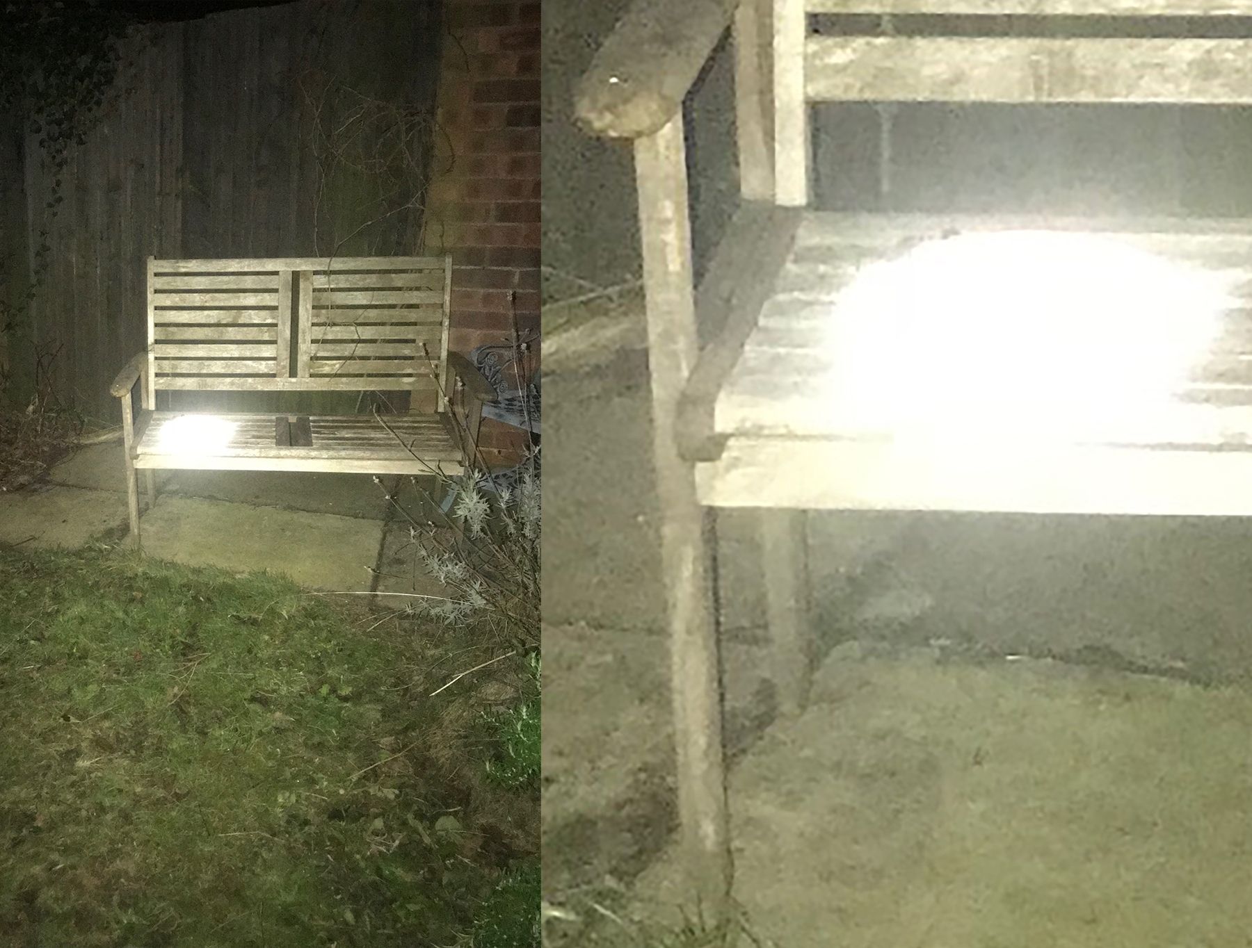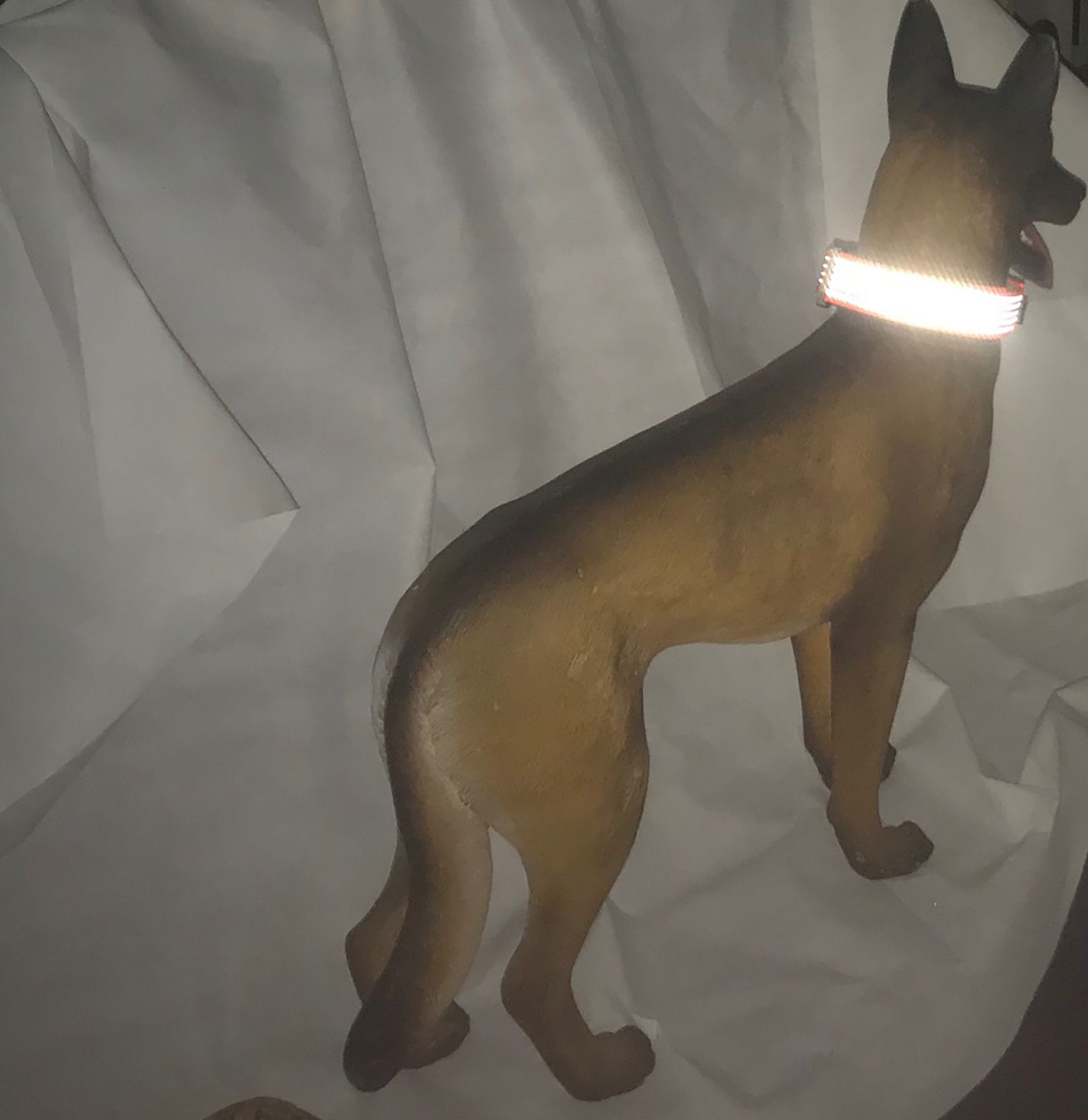 If you look at the picture of the collar on the chair you will see how bright it reflects light. This picture was taken with an IPHONE and the flash on. You can not even make out the collar as the reflection of the glow material is so bright.