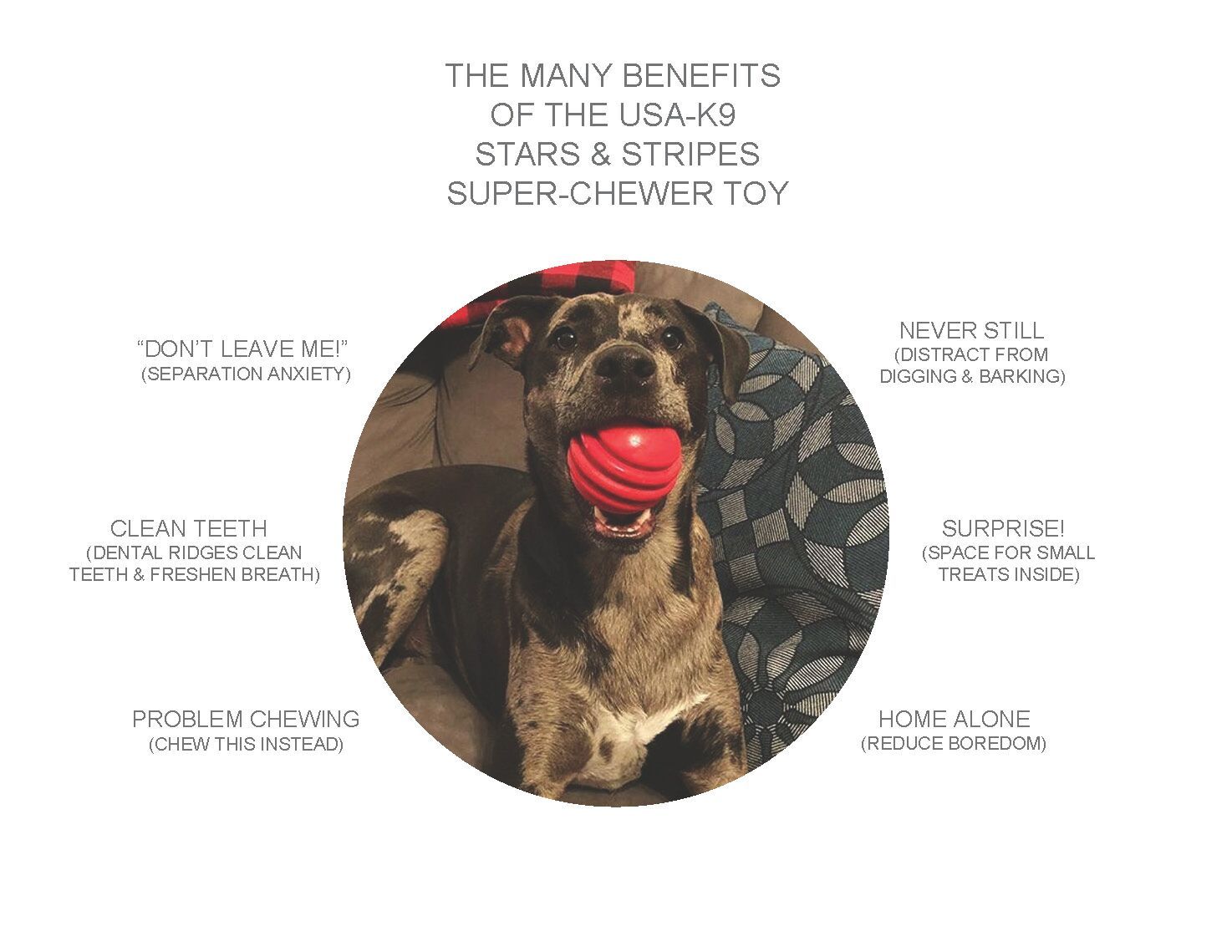 Dental Ridges: The ridges on the Stars and Stripes ball are stimulating for your dog while also cleaning your dog's teeth while he chews, helping prevent tooth decay and bad breath.