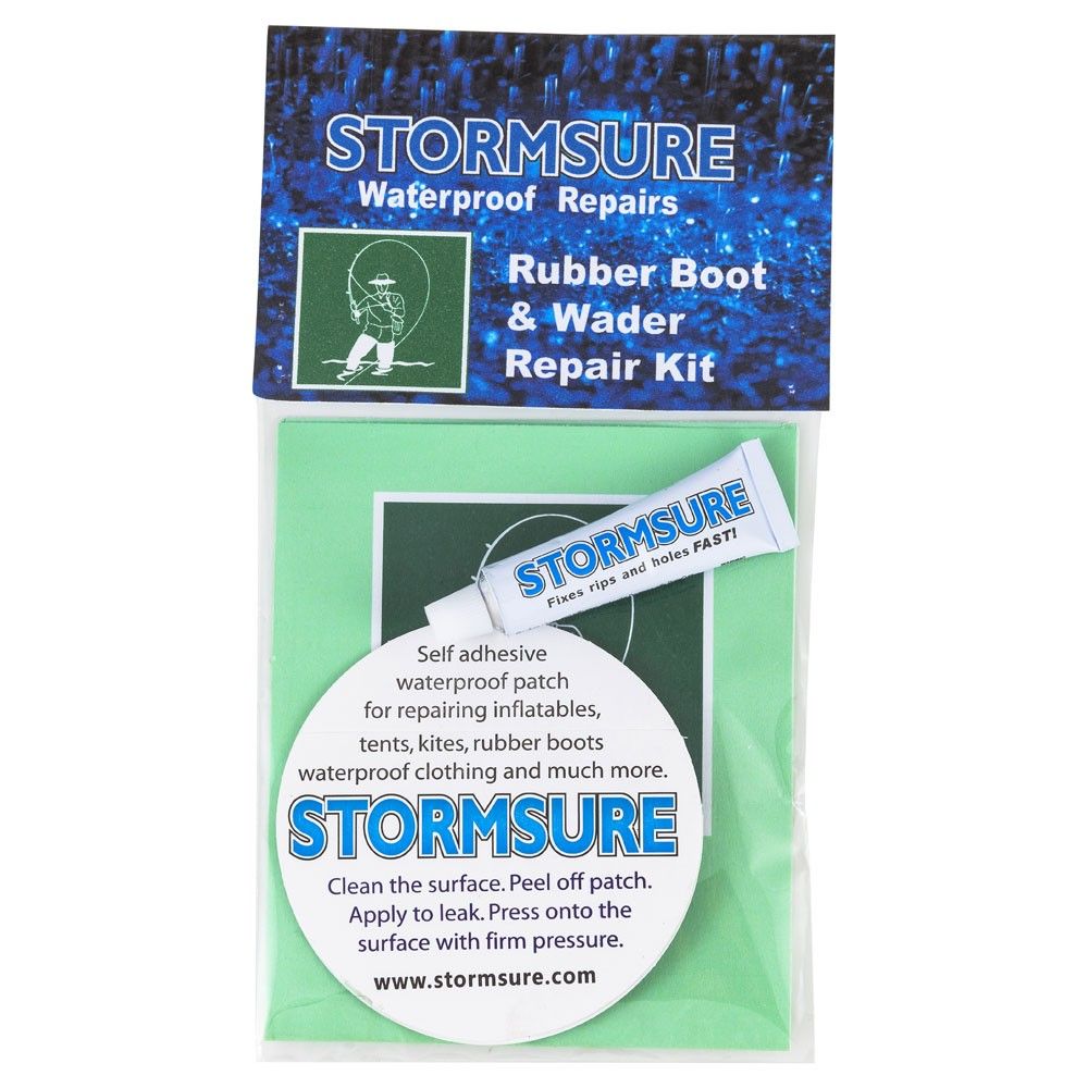 Use patches on waders and flat surfaces of boots for instant repairs. For awkward splits and holes and over seams and stitching use the Stormsure Adhesive. This will allow for a permanent repair on all sorts of damage, and does not need a patch, even when covering a hole. The glue cures slowly and leaves a very tough flexible film, which will stick to leather, Gortex, nylon,most plastics, rubber and polyurethane. The film will not crack in freezing temperatures and is completely waterproof. The cured glue will probably have better abrasion resistance than the existing sole!