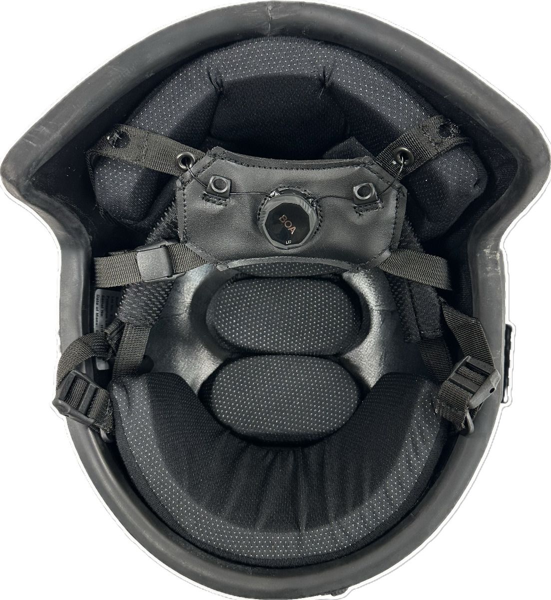 This helmet comes standard with the BOA® 4-point adjustable dial harness, allowing for quick, one-handed adjustments to ensure even tension and a secure fit. The system maintains stability even under the added weight of headborne accessories such as night vision devices, counterweights, or ear protection systems. The suede lined chinstrap is fully removable, allowing for easy laundering, replacement, or integration with respirator extenders.