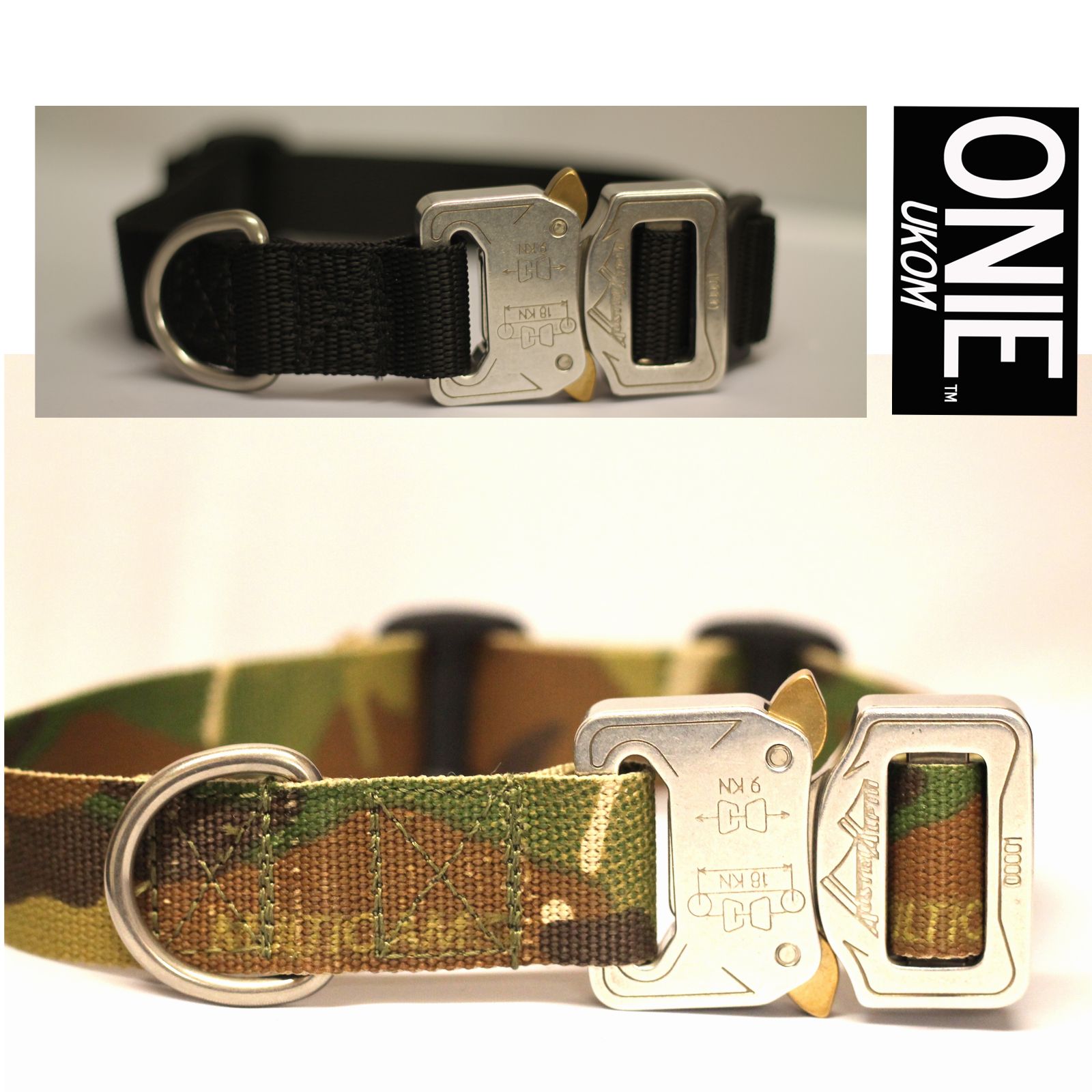 All webbing is IR Compliant and to MIL Specifications, this UKOM dog collar is available in both Black and Official Crye Reversible Multicam with a chrome Austrialpin  1” (25mm) Cobra Buckle. These patented buckles are currently deemed as the best buckle money can buy and are used today on belts worn by Special Operatives and Emergency Services Worldwide. The collar also features 2x ITW Nexus Black Triglides and a Chrome Metal D-ring.ITW Nexus are the world leaders in plastic hardware for the Military and Outdoor Market, there products are much sought after and all the best Military and Camping manufacturers use ITW Nexus buckles and other plastic hardware.