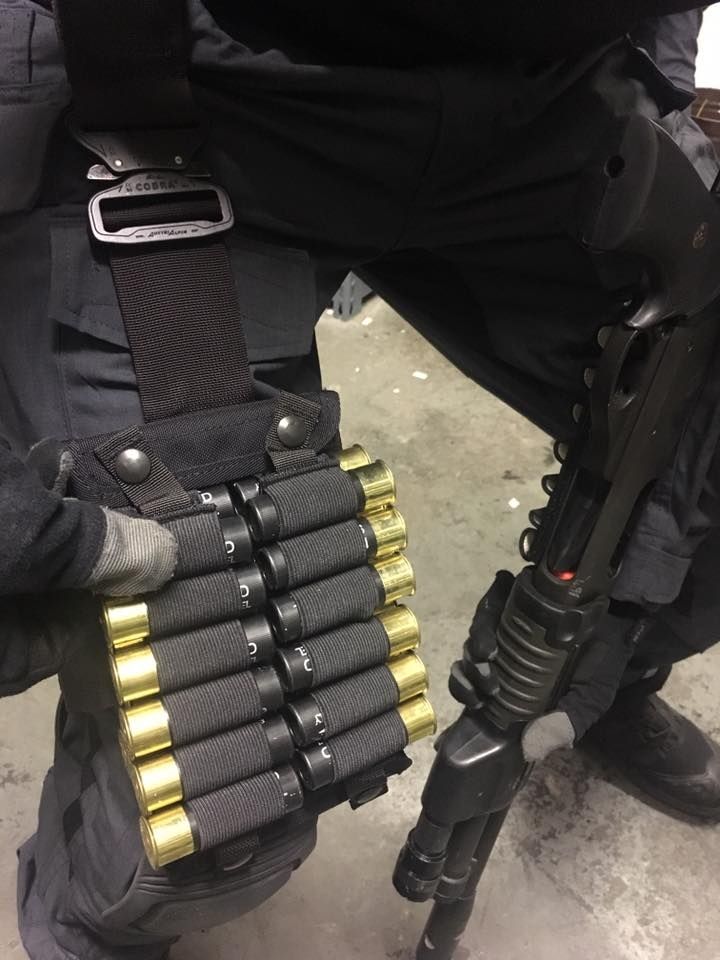 Designed by UK Couter Terrorism Specialist Firearms officers. Velcro backed drop leg platform that attaches a panel with 12 shotgun cartridge loops that in turn allow a 2 further strips of 6 shotgun cartridge loops to allow the operator a total of 24 shotgun cartridges to be held. Uses a belt loop with a clip that allows it to be easily removed.