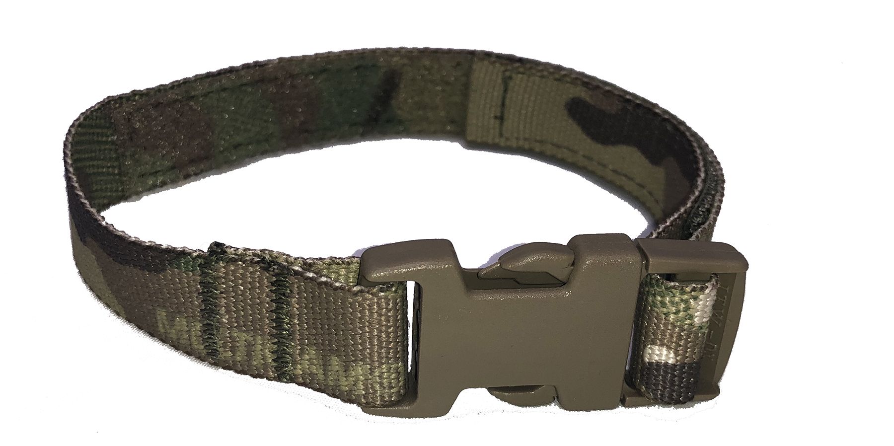 This collar uses official military specification Crye Multicam webbing and military specification ITW Nexus Buckle.