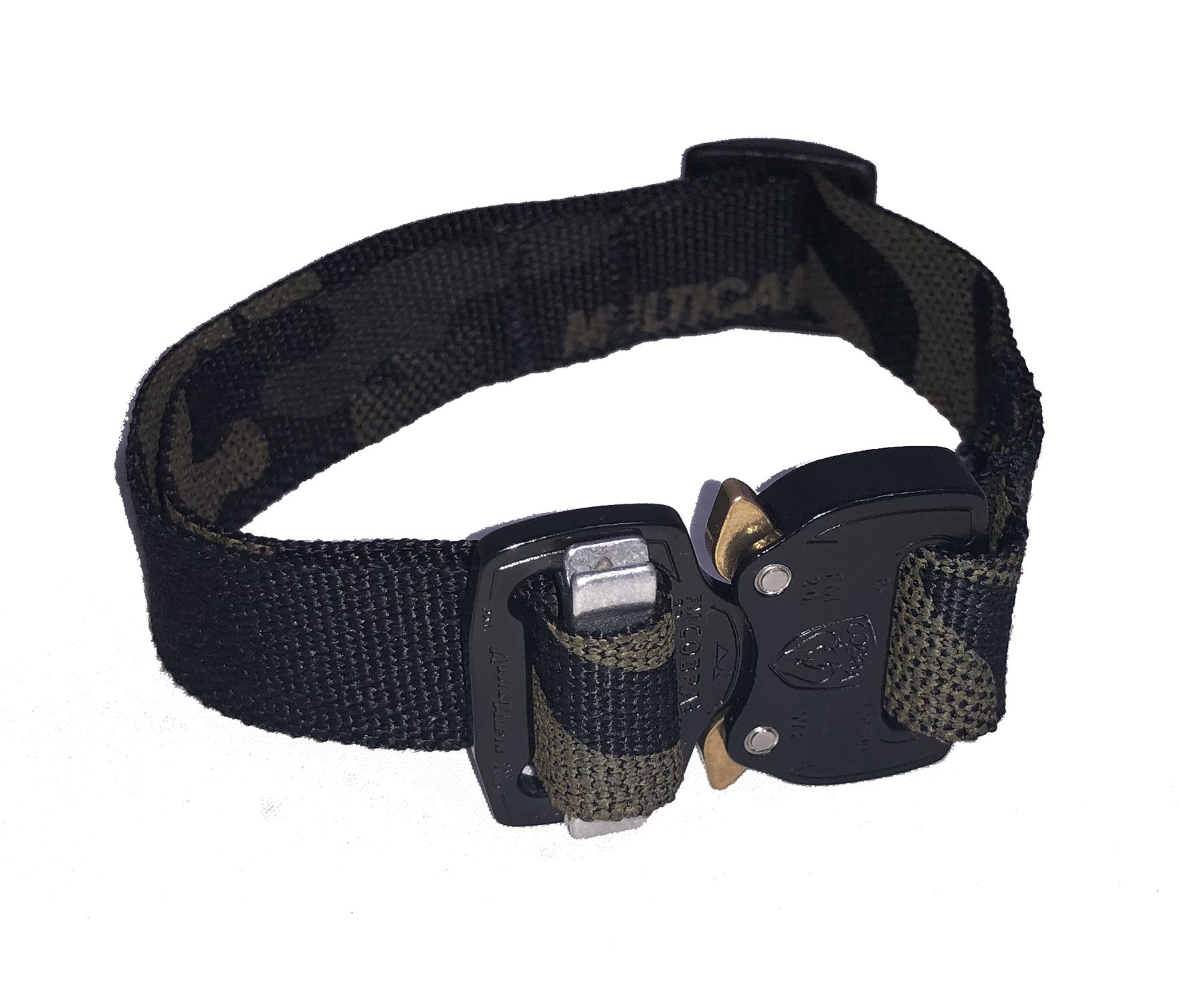 This collar uses official military specification Crye Multicam Black webbing a Triglide size Adjuster and the AustriAlpin Fashion Model Cobra Buckle.