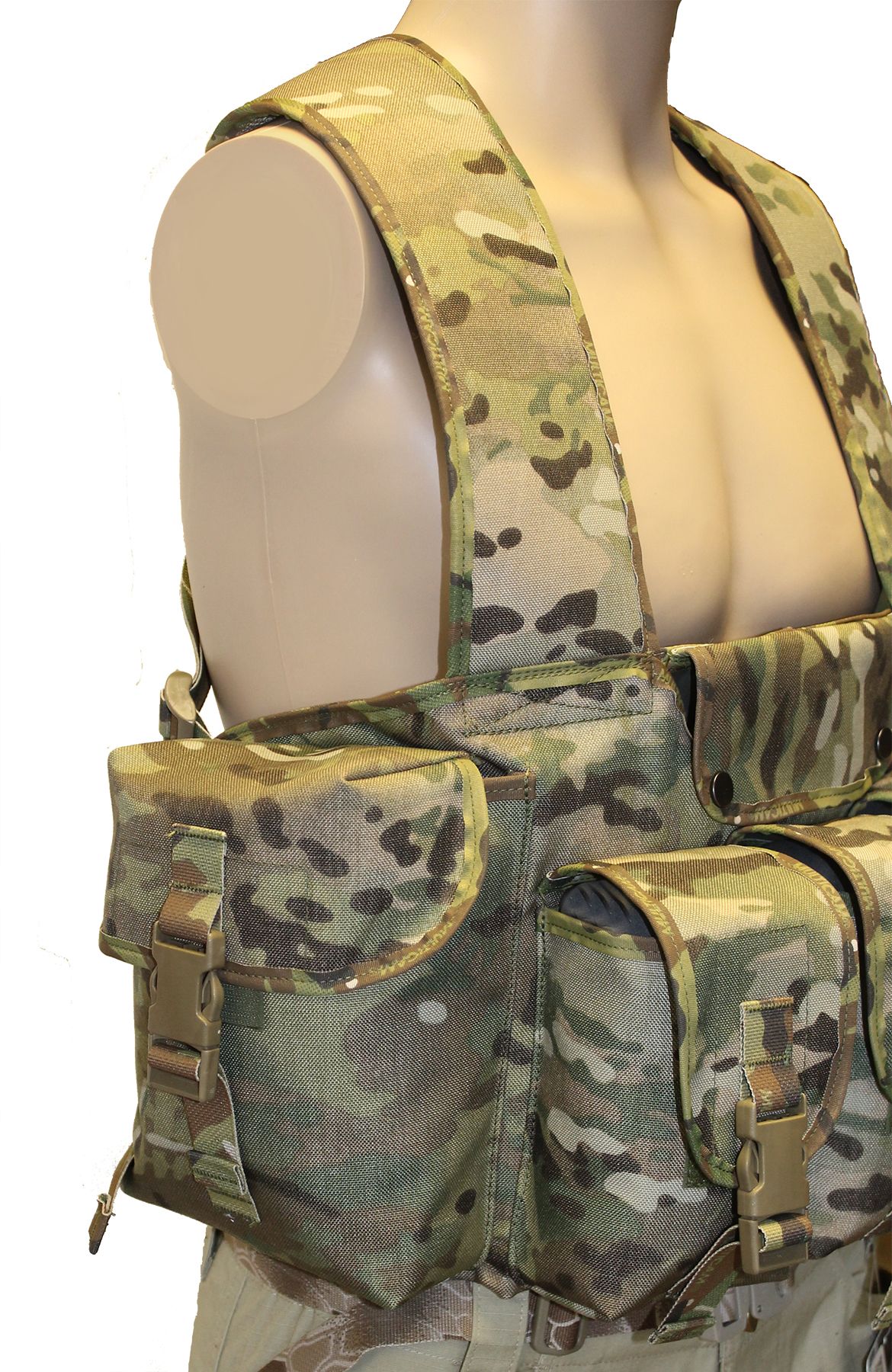 This Chest Rig provides the carrying capacity you need for a full combat load. It will fit over most standard vests but is comfortable enough to wear solo. It features three, centered pouches intended for magazine storage.